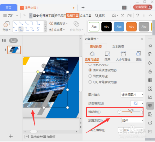 我们选中填充好图片的外形,在右边把透明度调整为【52%】,如图所示。