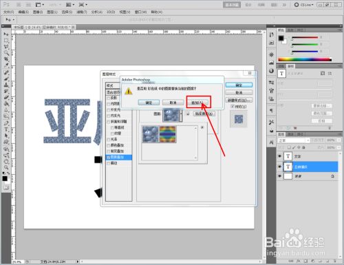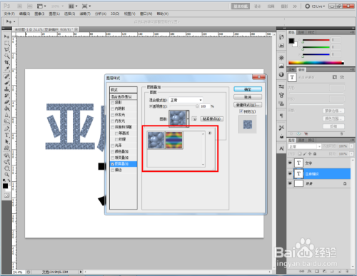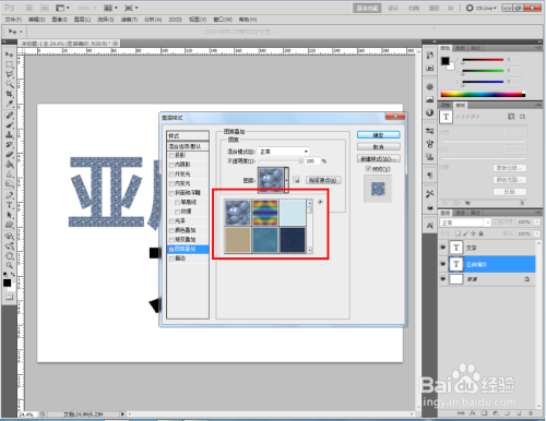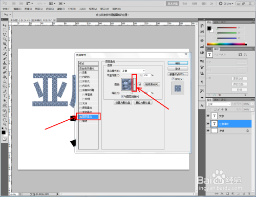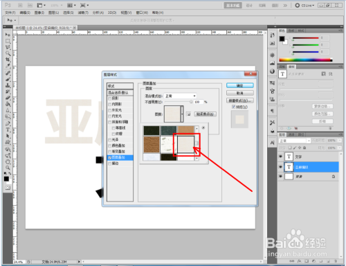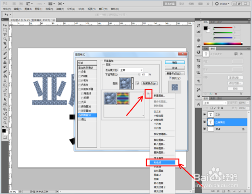 双击图示自界说图案图层,弹出图层样式设置栏。勾选【图案叠加】,点击图示小三角,弹出图案选项栏;