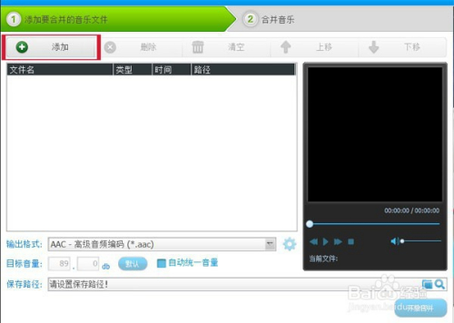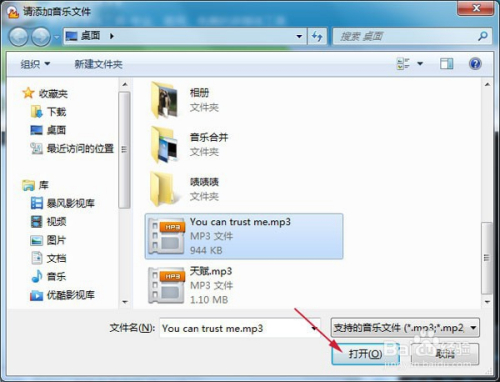 点击添加的按钮之后,就有一个请添加音乐文件的页面了,我们找到音乐文件夹,然后点击打开。