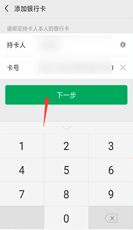 - 6输入支付密码,输入持卡人和卡号,点击“下一步”。