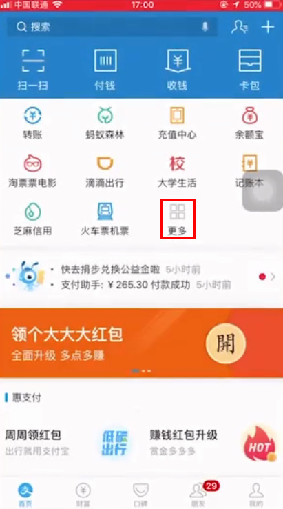 - 1打开“支付宝”,点击首页中的“更多”选项。