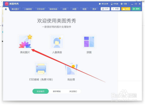 第一步也是最简单的一步,就是在美图秀秀的本家儿界面点击左上角的“美化图片”。