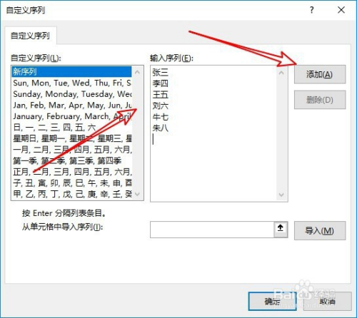 在打开的自界说序列的窗口中输入序列的窗口中,然后点击右上角的“添加”按钮。