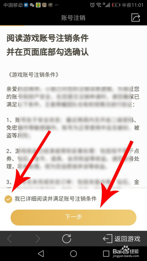打开账号刊出前提界面进行查看,查看完毕后勾选账号刊出前提,然后点击“下一步”。