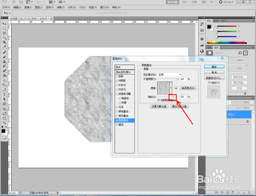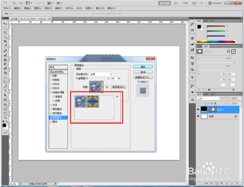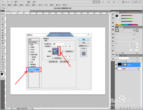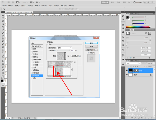 双击图示自界说图案图层,弹出图层样式设置栏。勾选【图案叠加】,点击图示小三角,弹出图案选项栏;