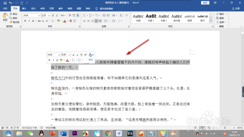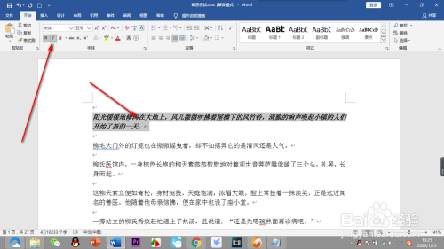 1.打开文档之后,首先用鼠标将第一段文字刷黑,选中文字才可进行操作。