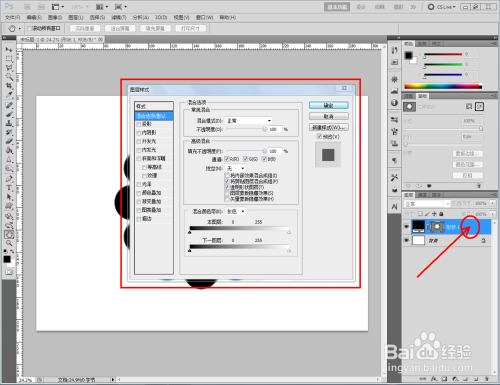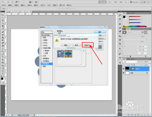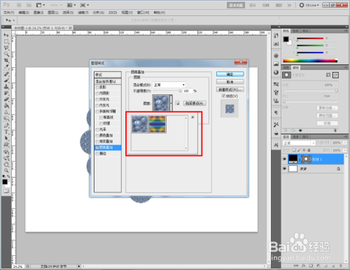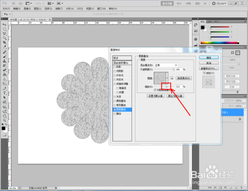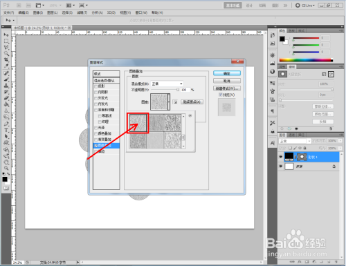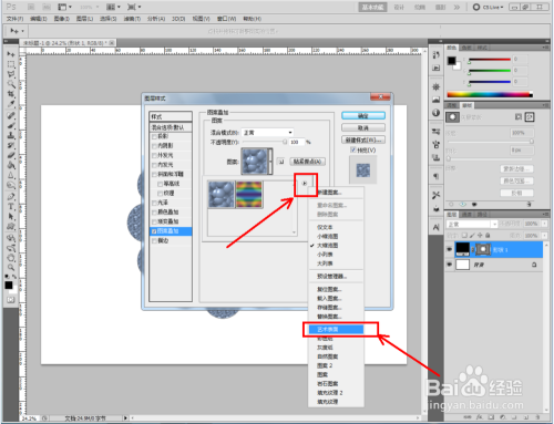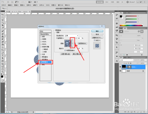 双击图示自界说图案图层,弹出图层样式设置栏。勾选【图案叠加】,点击图示小三角,弹出图案选项栏;