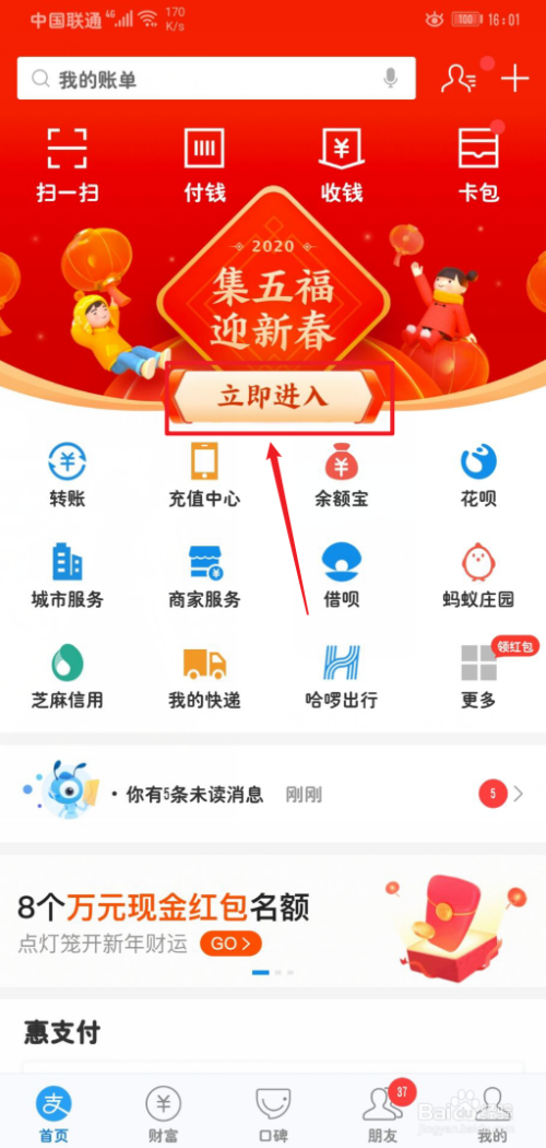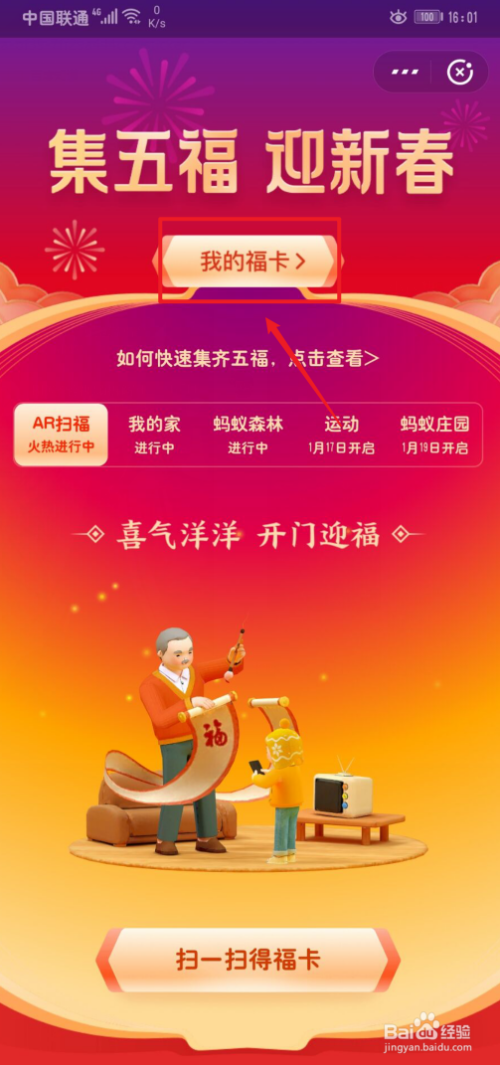 在本家儿界面上找到集五福活动,而且点击当即进入按钮。