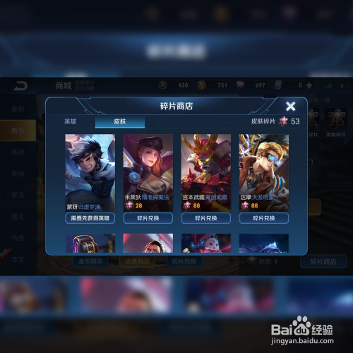 我们在上方菜单栏中可以找到皮肤,点击皮肤,此时我们进入到了皮肤兑换界面,右上角显示拥有碎片的数目,达到足够数目后就可以兑换啦