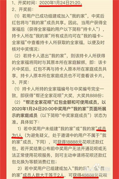 全家福开奖是在1月24日晚上9:20,全家福编号完全一致的人即中奖,在我的家里面当作员全都获得帮还花呗红包,累计最多获得48888元,若是一人可获得18888元。心动了吧,赶紧去集福卡吧。