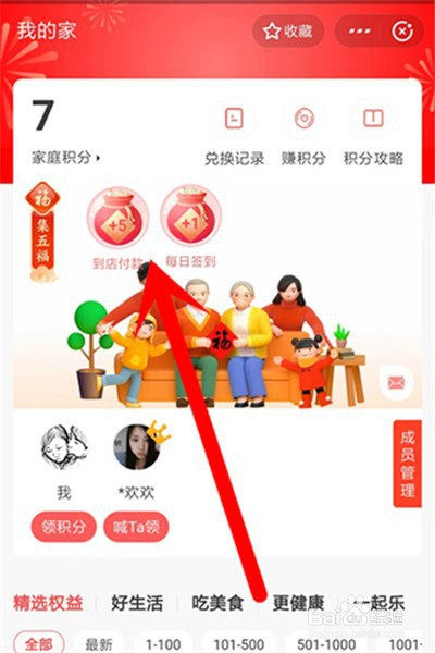 在我的家里面,进入我的家首页,天天可以经由过程签到或者到店付条目获得福卡。