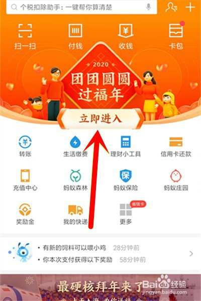 而全家福卡获得体例是任何一种获得福卡的体例都可以获得。我们首先打开支付宝首页,在首页团团聚圆过福年处,点击当即进入。
