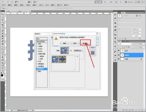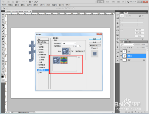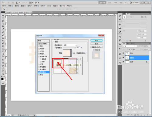 双击图示自界说图案图层,弹出图层样式设置栏。勾选【图案叠加】,点击图示小三角,弹出图案选项栏;