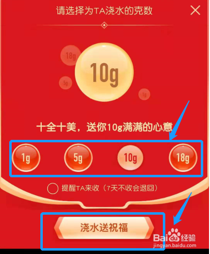 选择为TA浇水的克数,然后点击“浇水送祝福”。