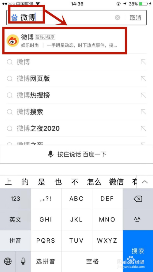 2.输入搜刮微博,找到后并点击进入微博小程序。