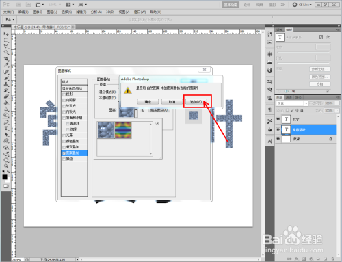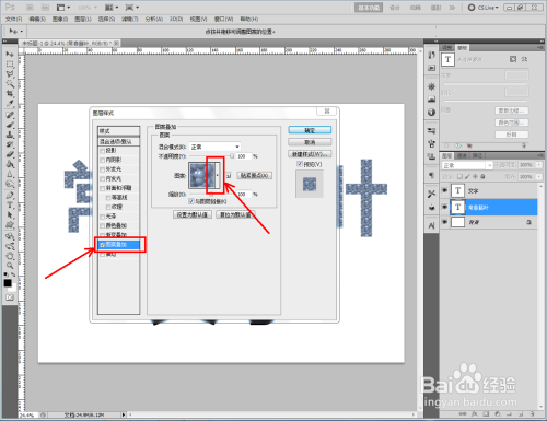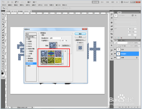 双击图示自界说图案图层,弹出图层样式设置栏。勾选【图案叠加】,点击图示小三角,弹出图案选项栏;