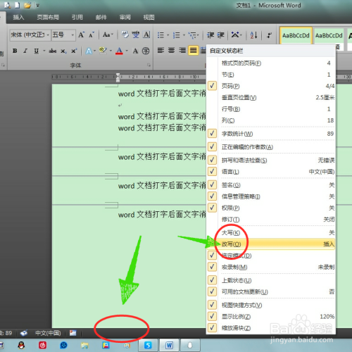 第三步:若没有“改写”字样将鼠标移动到左下角状况栏上,单击鼠标右键在弹出的自界说状况栏中点击“改写”。