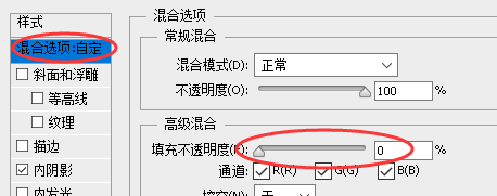 在【夹杂选项:自定】中将【填充不透明度调为0】。