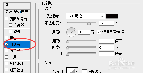 在内暗影中,将【不透明度】设置为100%,【大小】设置为4像素。