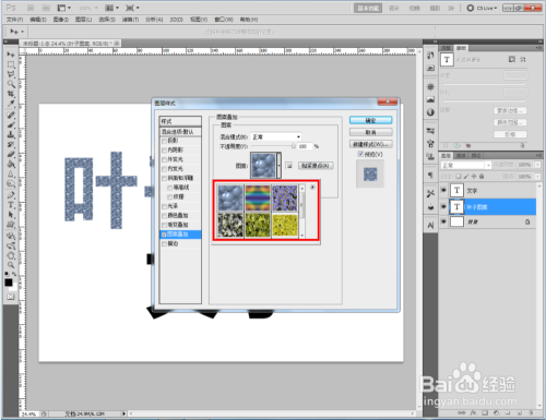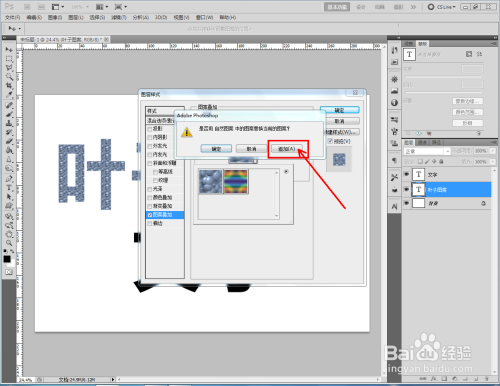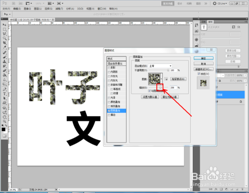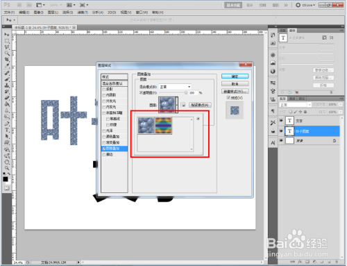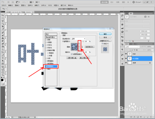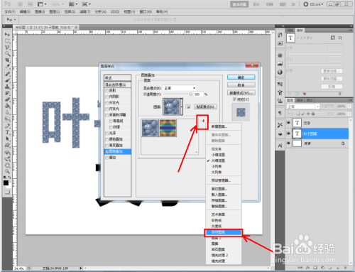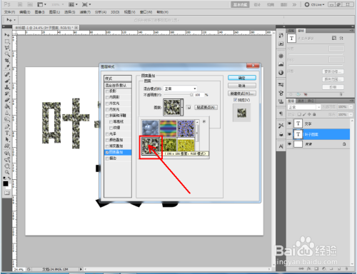 双击图示自界说图案图层,弹出图层样式设置栏。勾选【图案叠加】,点击图示小三角,弹出图案选项栏;