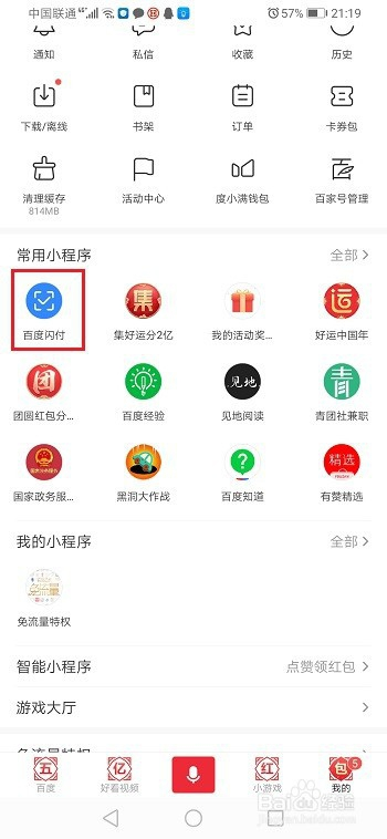 第一步打开百度,进去我的界面,点击百度闪付,如下图所示: