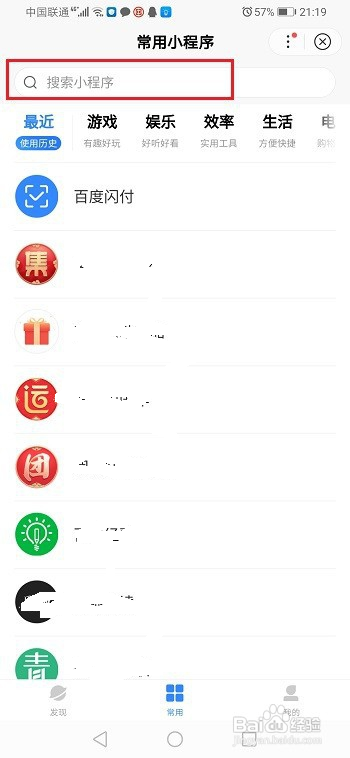 第二步也可以进去常用小程序里面,搜刮百度闪付,如下图所示: