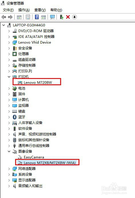 第六步:进入设备办理器,能看到打印机下的Lenovo M7208W和“图像设备”下的 Lenovo M72X8/M72X8W(WIA)。估量后面这个玩意儿就是扫描仪。