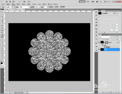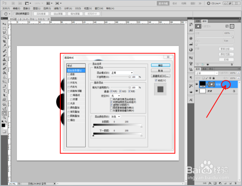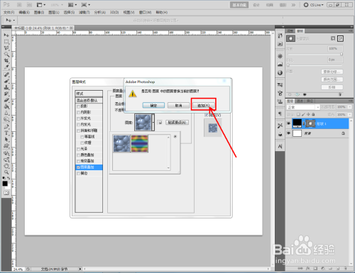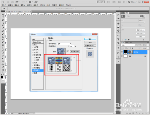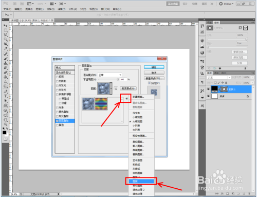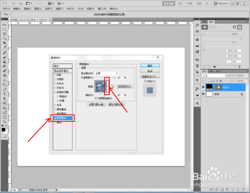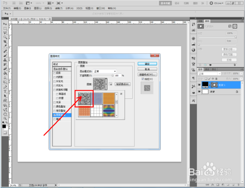 双击图示自界说图案图层,弹出图层样式设置栏。勾选【图案叠加】,点击图示小三角,弹出图案选项栏;