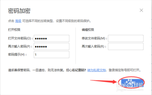 在“密码加密”对话框“打开权限”下,打开文件密码后的文本框中输入密码,再次输入密码后的文本框中再次输入不异的密码,在密码提醒后的文本框中输入提醒信息。编纂权限可按照本身需要来设置,本例没有设置。见下图