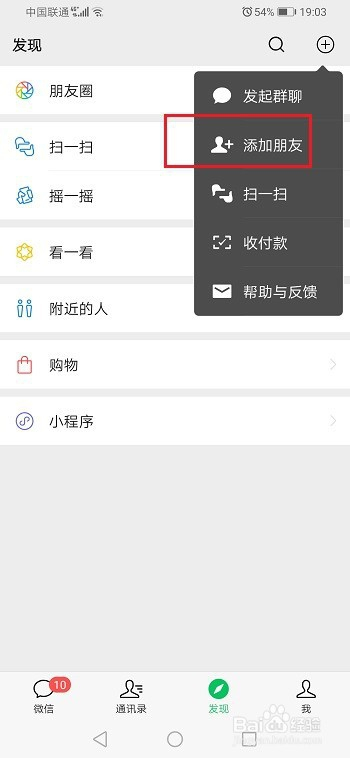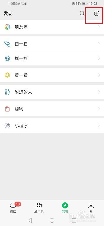 第一步在我们的手机上打开微信,进去发现页之后,点击+号图标,如下图所示: