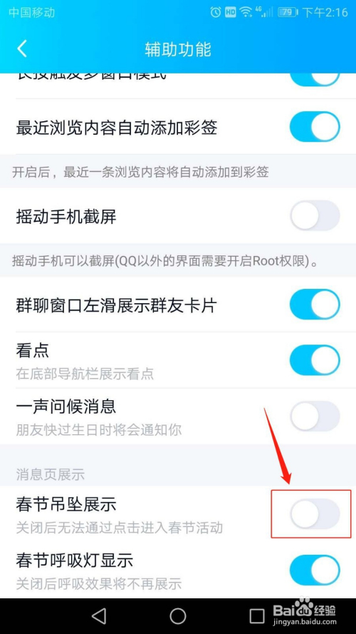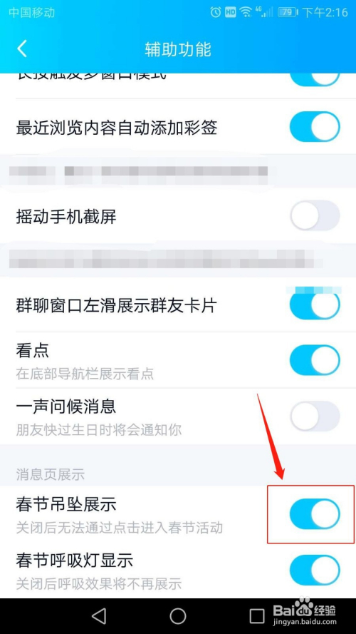 在“辅助功能”界面,标的目的上滑动页面,点击“春节吊坠展示”蓝色开关按钮。