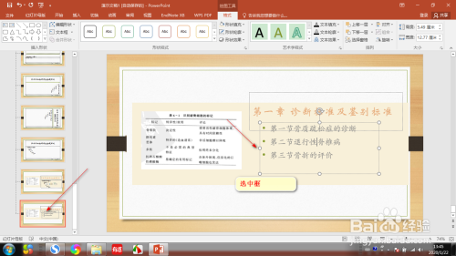 第一步选中最后一个幻灯片,然后选中想要复制格局的文本,呈现选中框之后再进行下一步操作,如图所示: