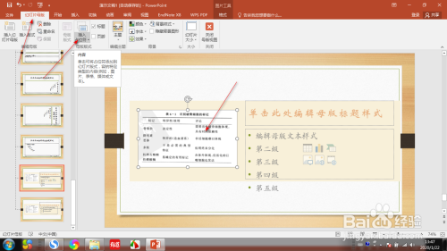 第三步移动至上方的模板幻灯片中,粘贴至母版文本样式,粘贴后模板文本会自行改变,然后再次插入占位符,如图所示: