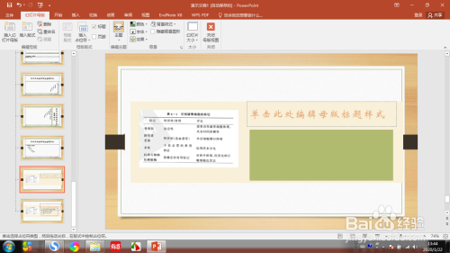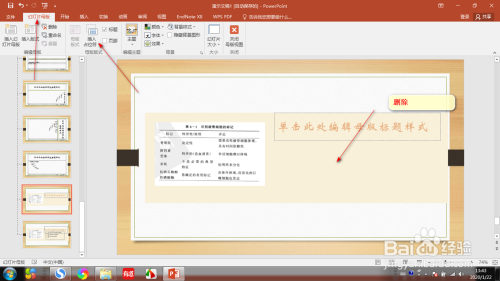 第三步,点击幻灯片模板选项,将倒数第二张幻灯片中的文本删除,然后插入母版版视图中的占位符,如下图所示: