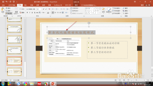 第一步,选中最后一个绘制好的幻灯片,然后选中题目,点击菜单栏中的格局刷选项,复制该格局,如下图所示: