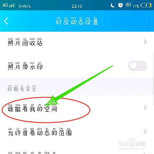 第五步:点击老友动态权限设置中的“谁能看我的空间”,即可设置空间权限。