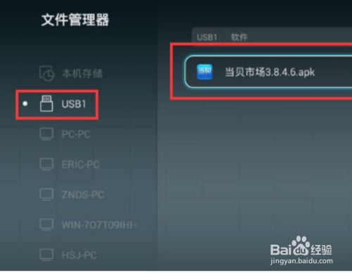 打开华为盒子首页,将光标移动到最上方,然后选择“文件办理”,打开文件办理后选择“USB1”,也就是U盘,就可以看到当贝市场的安装包,点击当贝市场安装包的名称,安装当贝市场,点击“安装”;