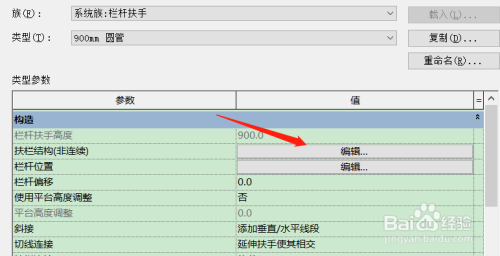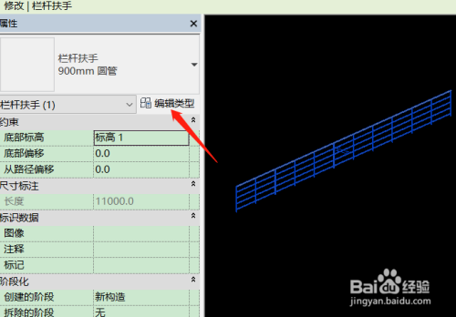 进入三维视图,选中雕栏,点击左侧属性栏中的编纂类型。如图所示