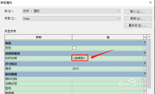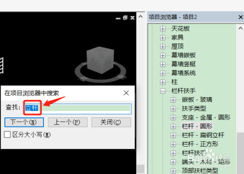 若是要点窜立杆材质,我们需要在族类型中点窜,在项目浏览器中,找到族,搜刮雕栏。如图所示