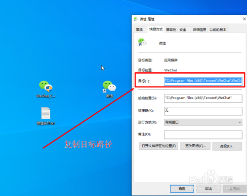 新建一个文本文档,定名为“微信多开”,右击微信快捷体例,打开属性。