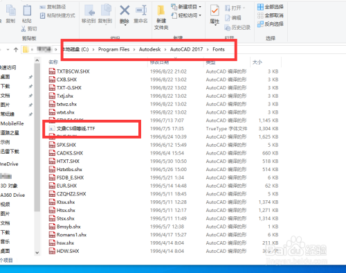 然后打开CAD2017安装目次下的Fonts文件夹(C:\Program Files\Autodesk\AutoCAD 2017\Fonts),将下载的字体复制到Fonts文件夹下,如图所示。