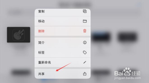 这时手机遇主动切换到库乐队的应用中,长按适才拷贝过来的铃声,在弹出菜单中点击“共享”。