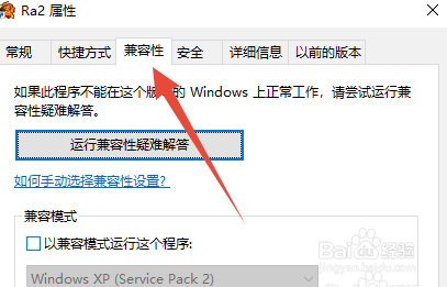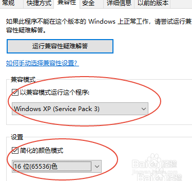然后再选择兼容性。如下图所示,选择XP和16位色。