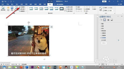 在格局选项卡下方有一个——调整栏,在调整栏中找到——压缩图片的按钮。