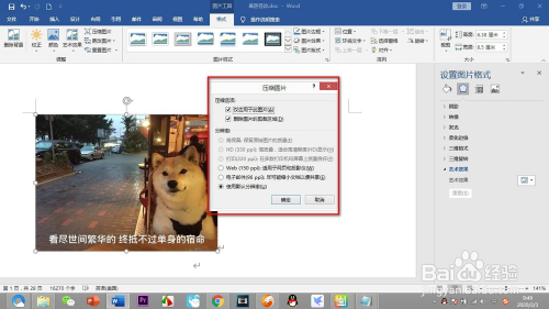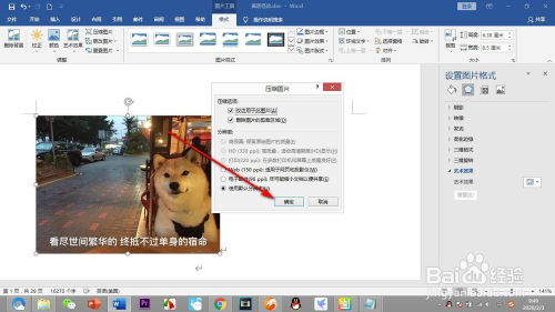 点击压缩图片,会弹出一个对话框,一般选择默认,若是是对所有图片进行压缩就将——仅应用于当前图片的对勾去失落。