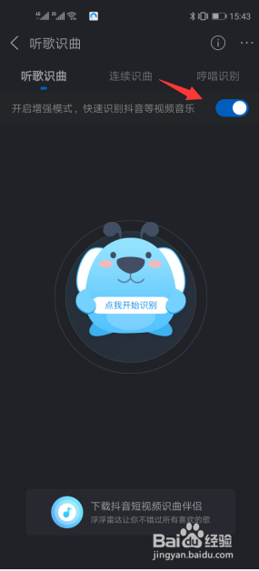 点击“开启加强模式,快速识别抖音等视频音乐”后面的开关。