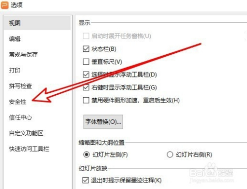 5、这时会打开WPS2019的选项窗口,点击左侧变来的平安性选项卡。