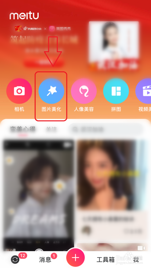 第一步:打开手机美图秀秀,点击“图片美化”,如下图所示。
