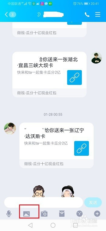 第一步手机上打开qq,进去聊天界面,点击图片图标,如下图所示: