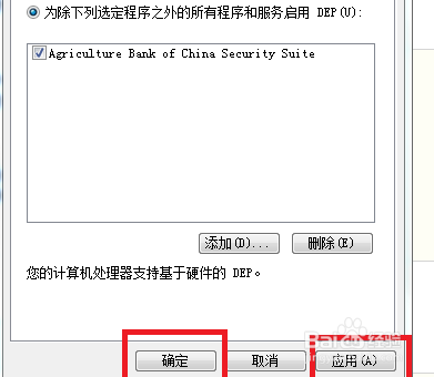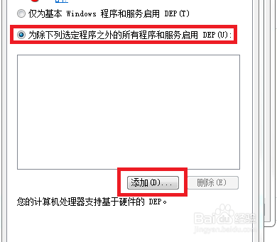 勾选为除下列选定的程序之外所有和办事启用DEP(U)选项,然后点击添加按钮。